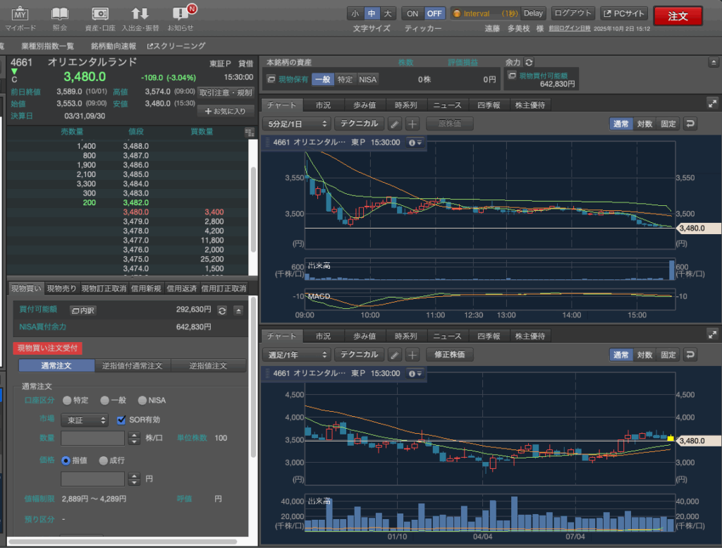 オリエンタルランドは、かなり読み失敗。明日は上昇トレンドにならないかな。。。