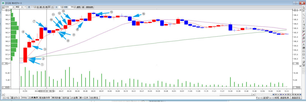 佐田さんのデイトレを見ながら始めた。値動きが良い三井海洋(6269)が強そうなので、今日は三井海洋にしよう。