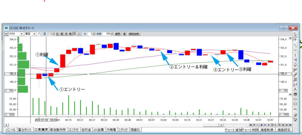 最近は、朝一のトレードでも5分くらい持つことに慣れてきたので、少ない値幅にトライしてみた。