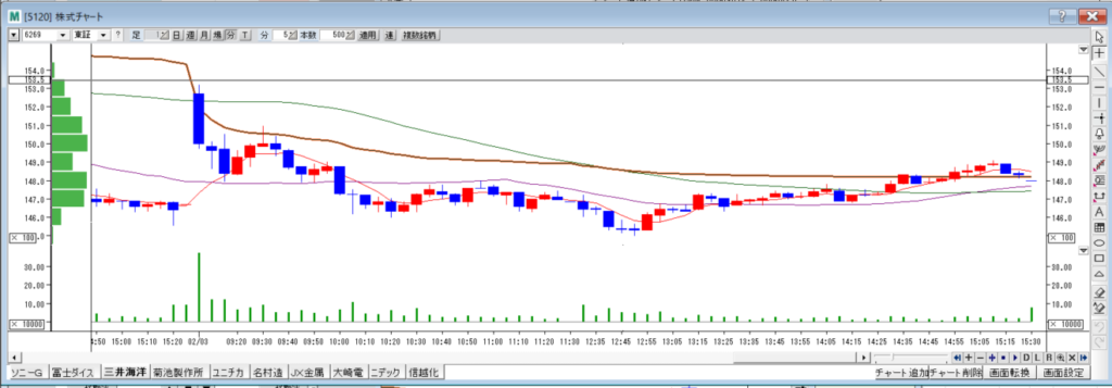 三井海洋は今日は弱い。何度かコツコツと、空売りと順張りで利確。