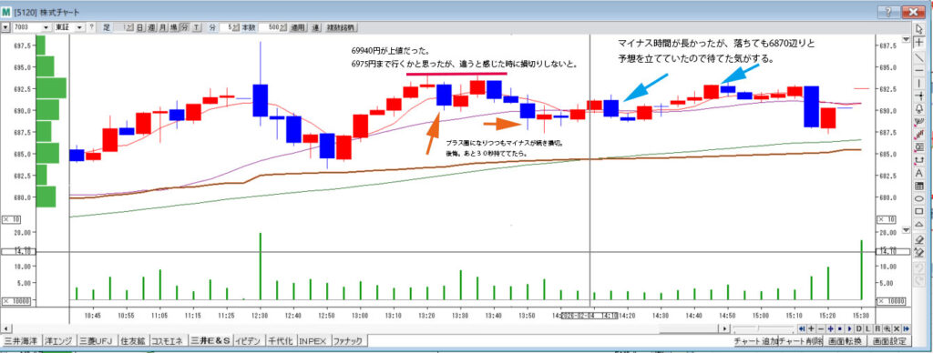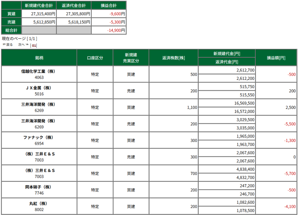 折角、損を減らすために100円単位の三井E&Sをしたのに、うまくいき始めると200株でエントリーしてしまって、損額が倍増する。
