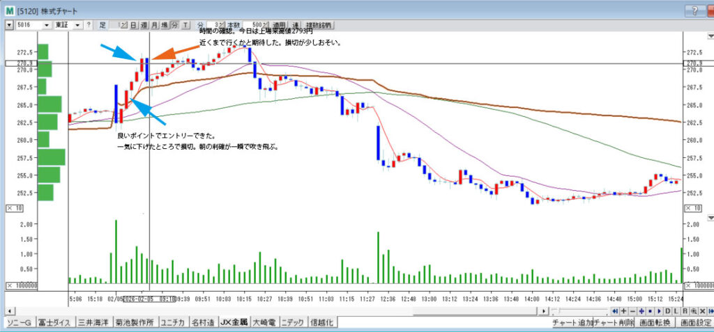 | 約定済 | JX金属 | 5016 | 売 | 100 | 2701.5 | 100 | 2701.5 | 9:32 | 450 | コツコツがうまくいった。この後、すぐに下げに転じた。 |