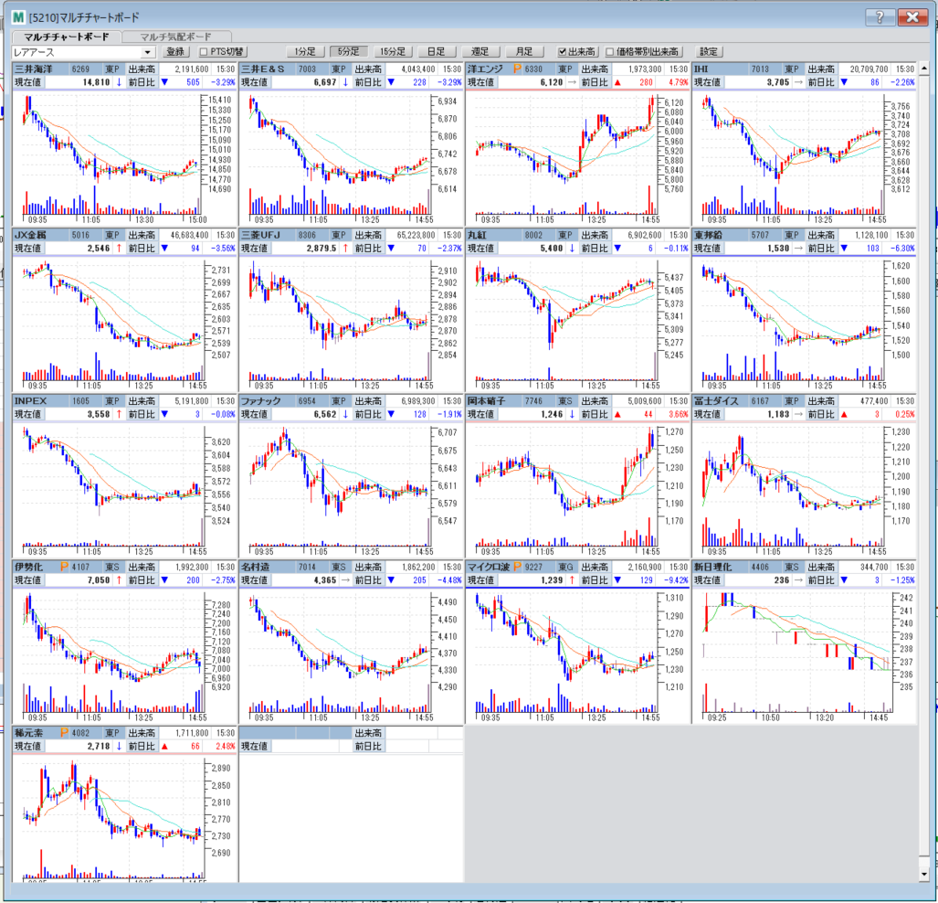 気分をかえて、危険な三井海洋へ。今日は弱いのとVWAPの下だったので売りでエントリー。すぐ利確。次は入った瞬間に陽線に。似たような銘柄も陽線に代わってしまったので、損切。読みは合ってて、一瞬の上げでそのあとダダ下がり。悔やまれる。損切のタイミングは難しい。損が膨らまないようにと、一番損が大きいところで損切りしているような気がする。