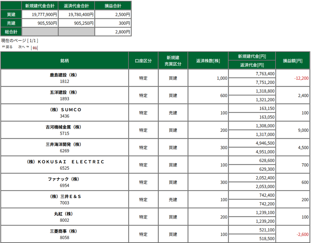 今日の結果(損益):