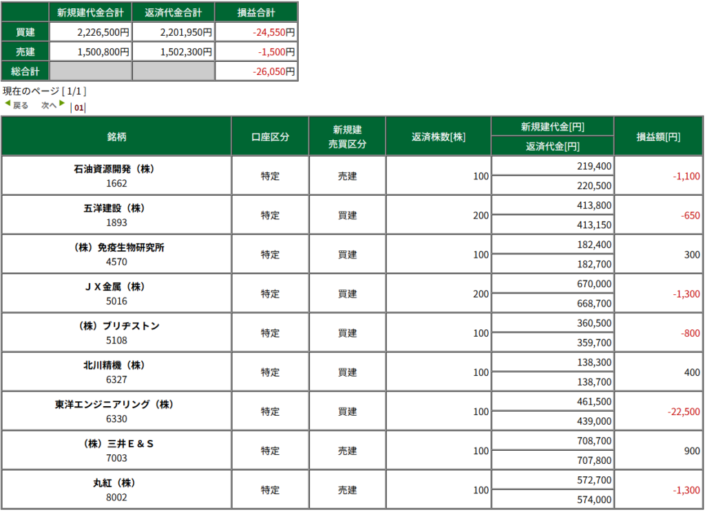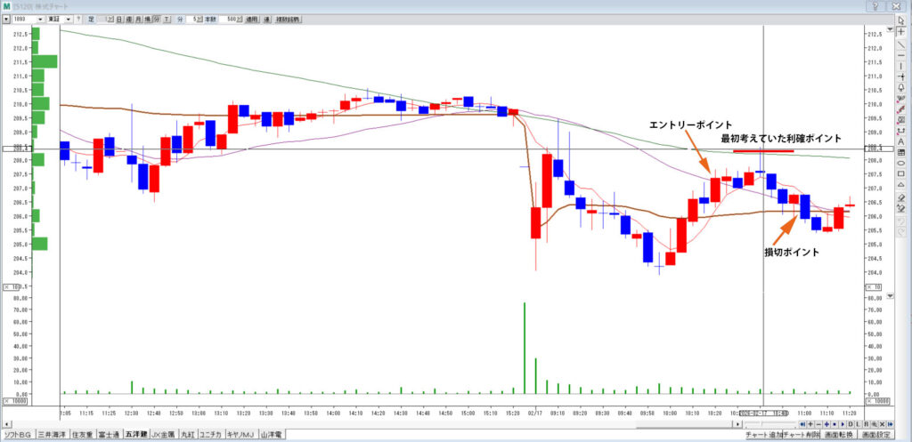 一番悔やまれるのは、五洋建設。買いの価格はともうまくいきプラス圏での待ち時間が長い。0.5円刻みなのでしっかりと値も見える。今日の騰落率0%の値が2077.5円。厚い板が入っているわけではないのにその手前で何度も跳ね返され、値が伸びない。2080円のところに少し厚めの板があったが、2077.5円を突破したあと、強く上抜けたので目標値の2840円を待つ。すごい勢いだったので2840円を上抜いた後も利確できず、結局損切りすることに。。。欲が損を招いた。