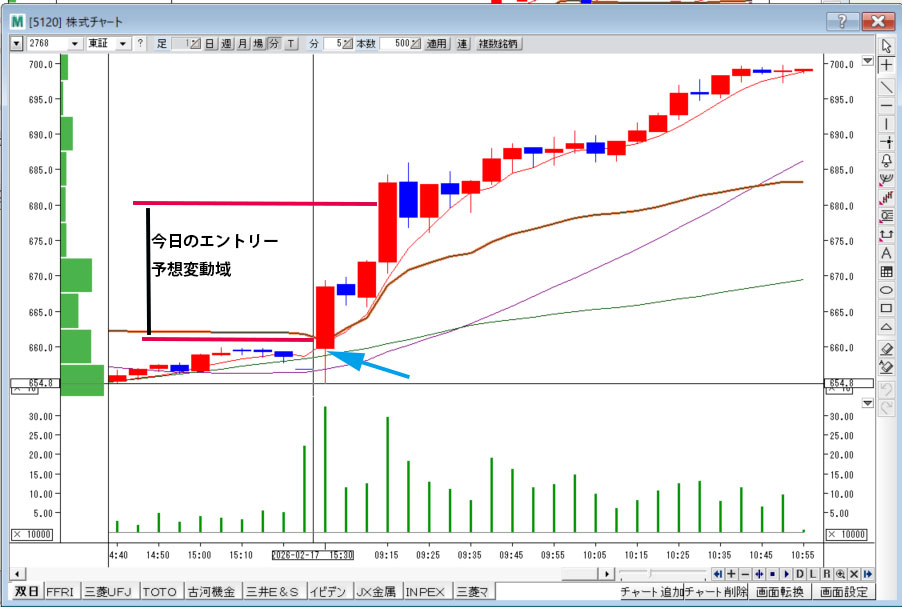 6600円が押し目買い付近と思ったが、もっと下げた。6600円を抜いてきたところでエントリー。