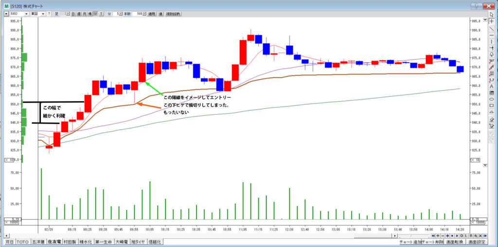 最初のエントリーが9時10分。今日の高値を抜いたところでエントリー。細かく利確。